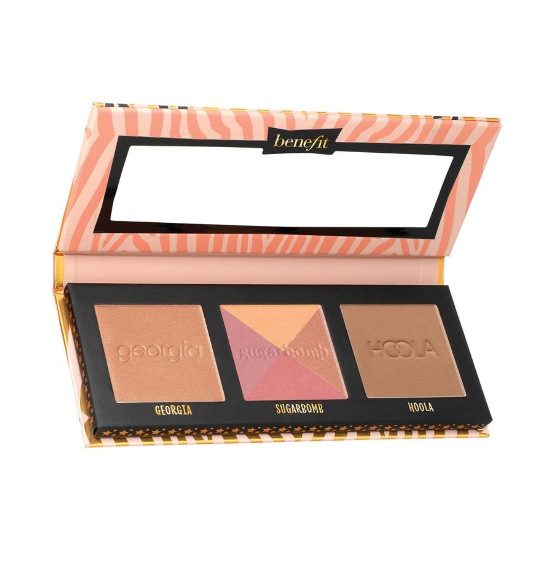 The softly shimmering 'Georgia' pan has a peachy tone that uplifts any complexion with a subtly flushed glow. The ultra-fine powder is infused with a delicate golden shimmer and can be built from a barely-there wash of colour to a vibrant, radiant flush. Swirling together for a balanced burst of rosy-pink radiance, the 'Sugarbomb' pan holds a quartet of peach, soft plum, warm bronze and rich rose hues to accentuate and warm your cheeks. The palette also includes arguably one of the most iconic and adored bronzers in the industry: 'Hoola'. This buttery golden-bronze pan leaves a pure matte finish, so you can forget about tell-tale sparkle and shine and fool everyone with your natural-looking sun-kissed glow. We're obsessed!