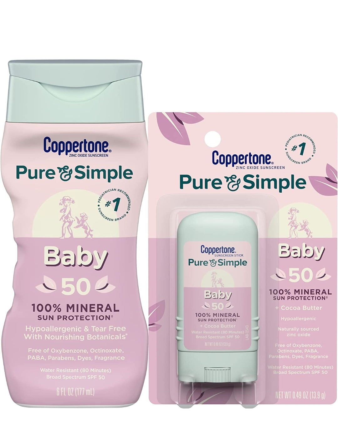 Playing outside is a lot more fun when your little ones are protected with Coppertone Pure & Simple Baby Sunscreen. From the #1 pediatrician recommended sunscreen brand(2), this Coppertone sunscreen is hypoallergenic and gentle. Coppertone Pure and Simple sunscreen for baby is a water resistant (80 minutes) Broad Spectrum sunscreen with nourishing botanicals (tea leaf, sea kelp and lotus extract). Delivering Broad Spectrum SPF 50 UVA/UVB protection, this gentle sunscreen contains 100% naturally sourced Zinc Oxide. This Coppertone sunscreen formula is tear free, and is free of fragrance, PABA, parabens, dyes, and octinoxate and oxybenzone. Apply this baby sunscreen to your baby's skin whenever the fun takes you outside. Coppertone is voted the most trusted sunscreen brand (1), and each sunscreen Coppertone creates follows a tradition of trusted, quality sun protection products. Use and reapply as directed. (1)Voted Most Trusted Sunscreen Brand by American Shoppers Based on the 2022 BrandSpark American Trust Study. (2)According to IQVIA, Provoice Survey From June 1, 2021 to May 31, 2022