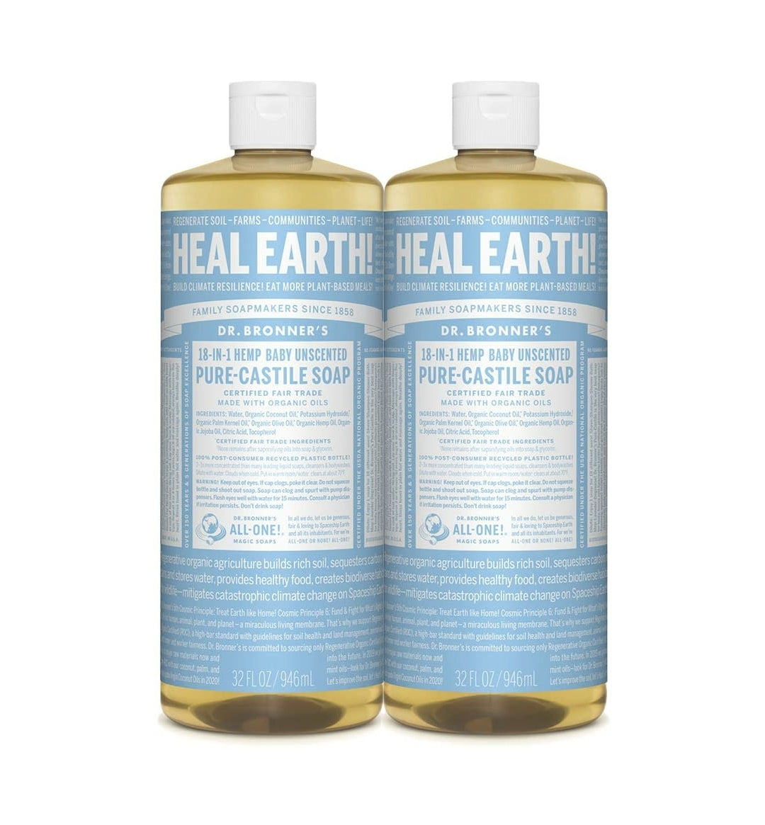 Our guiding principles: make humble and mindful use of the Earth’s gifts—what comes from the Earth must go back! Healthy soils, healthy farms and green factories make great soap! Dr. Bronner’s works with farmers to implement regenerative organic practices. Our coconut, palm and mint oil farms in Sri Lanka, Ghana and India sequestered ~16,000 MT of CO2 —removing greenhouse gases from the environment to help mitigate climate change. Our factory is powered by renewable energy and the soap we make is completely non-toxic and biodegradable. Preservative free, detergent free and foaming agent free! All our cylinder soap bottles are made from 100% post-consumer recycled plastic. Let’s regenerate and heal earth! All-One!