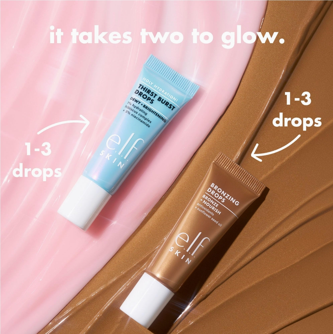 What it is: It takes two to glow! Meet skincare’s most lit couple, available in one kit: e.l.f. SKIN’s Holy Hydration! Thirst Burst Drops and Bronzing Drops.