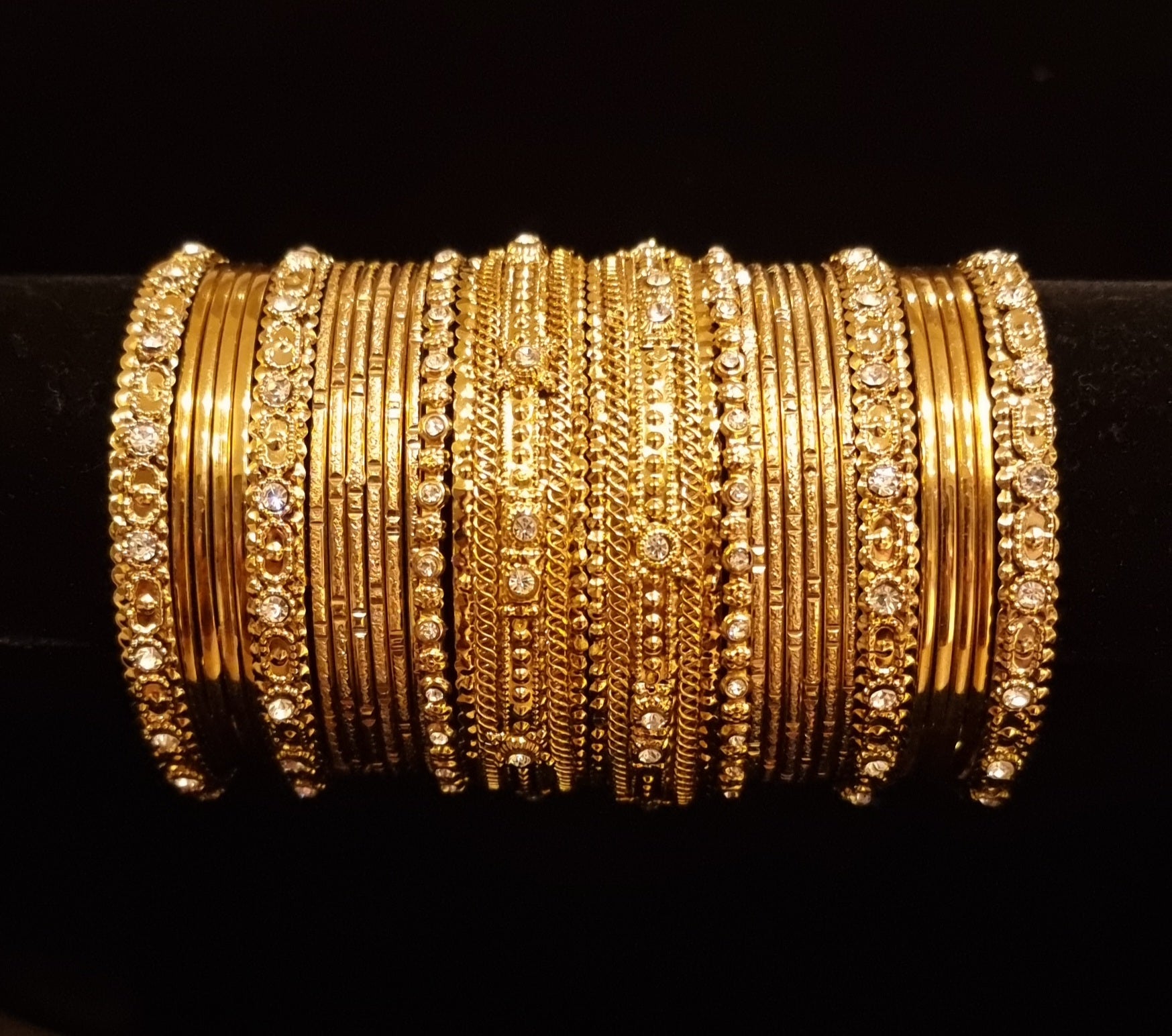 An outstanding bangle set made up with gold diamante stone bangles finished off with with gold bangle inserts all set on a top quality gold plated finish.