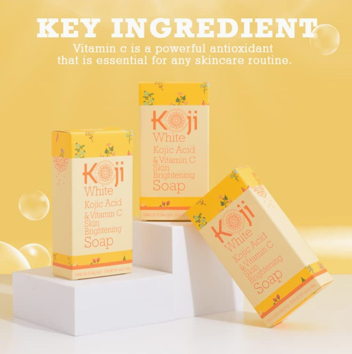KOJI WHITE KOJIC ACID & VITAMIN C SOAP delivers clean, soft, glowing skin. Vitamin C is a powerful antioxidant that is essential for any skincare routine. Vitamin E and honey nourish and soften skin, while kojic acid improves luminosity. Skin appears more radiant and even with regular use.
