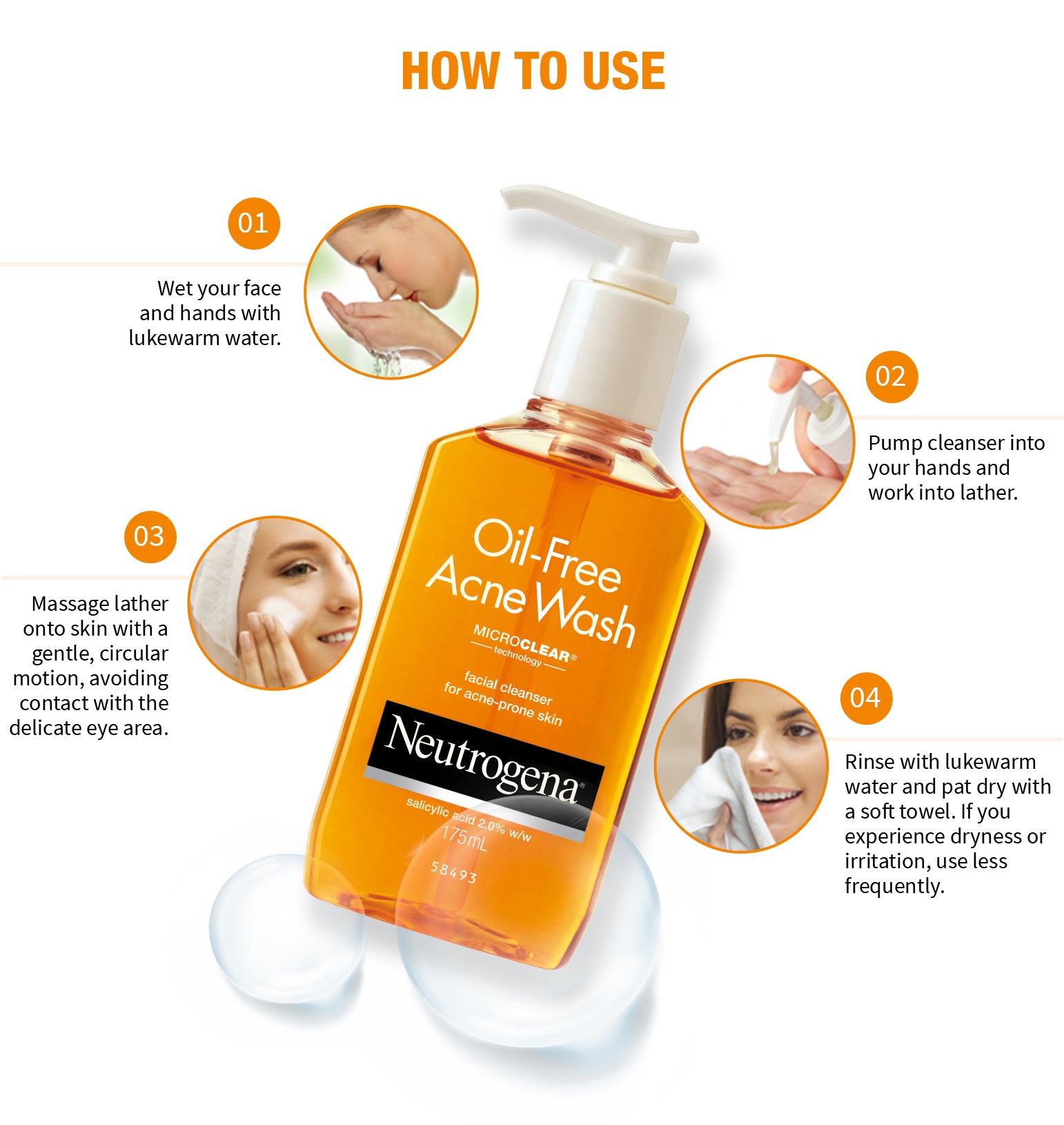 Cleanse twice a day. Wet face. Apply to hands, add water and work into a lather. Massage face gently. Rinse thoroughly. Other information Store at Room Temperature. Questions? Call toll-free 800-582-4048 or 215-273-8755 (collect). www.neutrogena.com