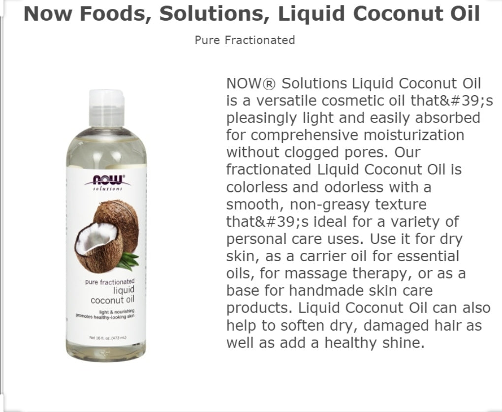 NOW Solutions Liquid Coconut Oil is a versatile cosmetic oil that's pleasingly light and easily absorbed for comprehensive moisturization without clogged pores. Our fractionated Liquid Coconut Oil is colorless and odorless with a smooth, non-greasy texture that's ideal for a variety of personal care uses. Use it for dry skin, as a carrier oil for essential oils, for massage therapy, or as a base for handmade skin care products. Liquid Coconut Oil can also help to soften dry, damaged hair as well as add a healthy shine.