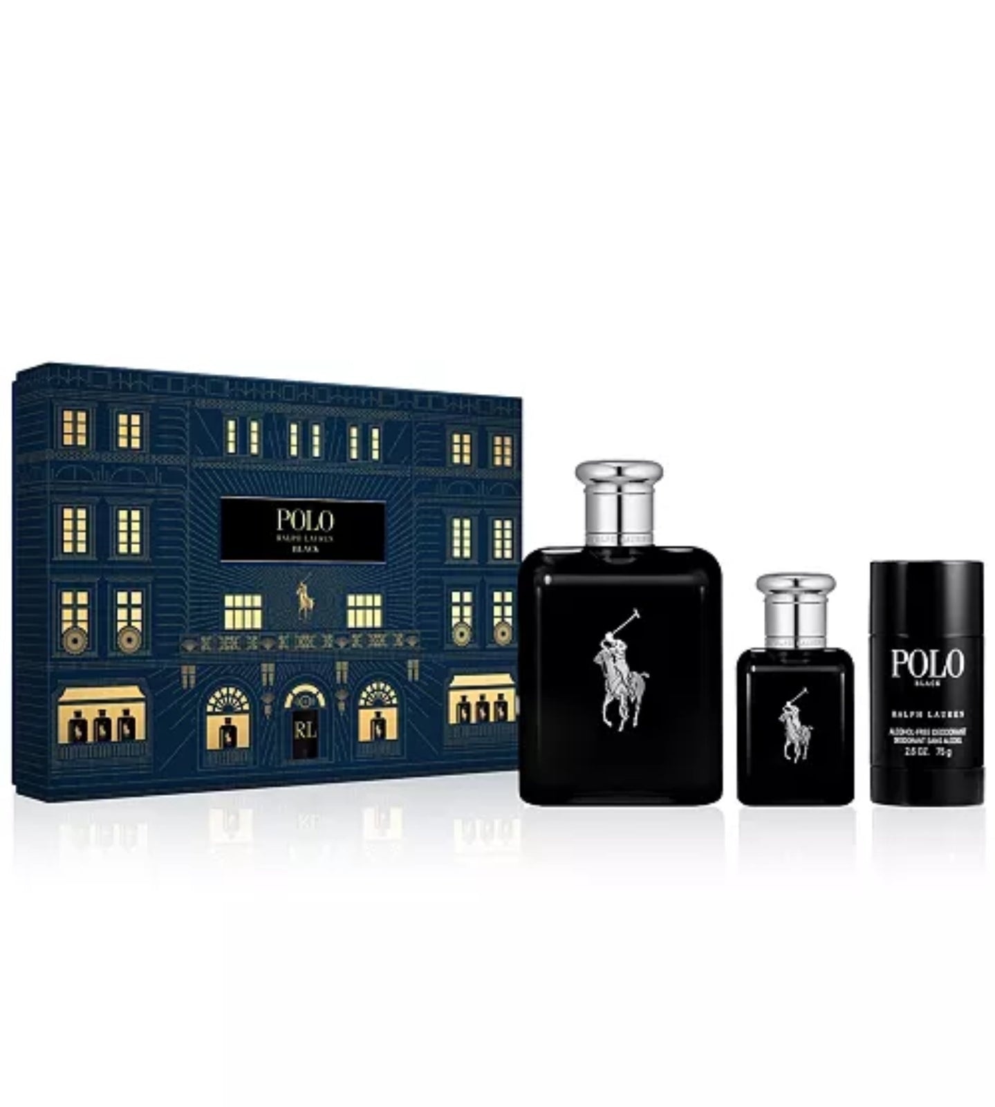 Journey to Holiday Wonder in the world of urban elegance with Polo Black Eau de Toilette. Evoke a black-tie night out on the town with this complex fusion of patchouli noir, icy mango and silver armoise. Give him the gift of a swirling scent with the luxurious three-piece fragrance gift set.