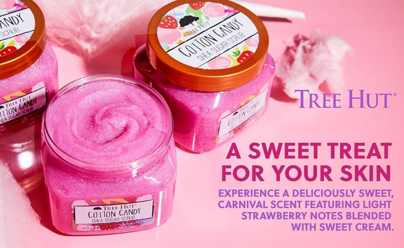 Reveal glowing skin with Tree Hut Sugar Body Scrub in theplayful scent of Cotton Candy! Made with Sugar, Shea Butter, Strawberry and an array of natural oils like Evening Primrose, Avocado, Macadamia, Sweet Almond, Safflower and Orange Oils. • Strawberry is known to contain skin-loving antioxidants and brightening Vitamin C while also adding juicy hydration • Shimmer adds a fun, playful experience during your scrub session and rinses clean • Sugar is a natural exfoliant that effectively polishes away dead skin while helping to boost circulation to the skin surface • Natural Shea Butter is known to deeply moisturize, nourish and soften dry, skin while helping to promote elasticity • Tree Hut Shea Sugar Scrubs feature a 6-oil blend of: Avocado Oil, Macadamia Oil, Sweet Orange Oil, Sweet Almond Oil, Evening Primrose Oil, Safflower Oil