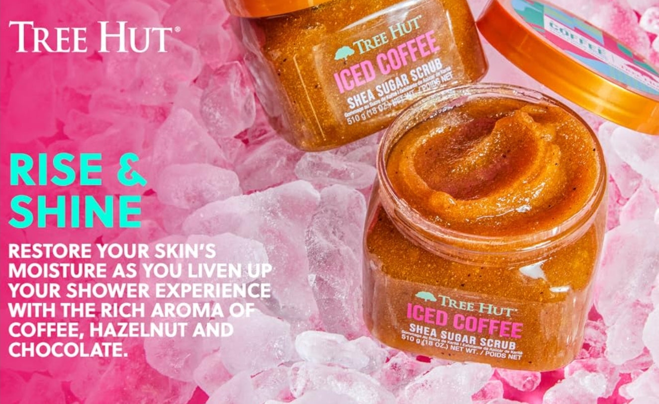 Reveal soft, glowing skin with the freshly brewed scent of Iced Coffee! Made with Sugar, Shea Butter, Arabica Coffee Fruit, Caffeine and our premium blend of Evening Primrose, Avocado, Macadamia, Sweet Almond, Safflower and Orange Oils to leave skin feeling good and smelling delicious. Tree Hut Sugar Scrubs are paraben free, vegan, sulfate free, alcohol free, contain no formaldehyde donors, and have a no-slip formula with a long-lasting fragrance.